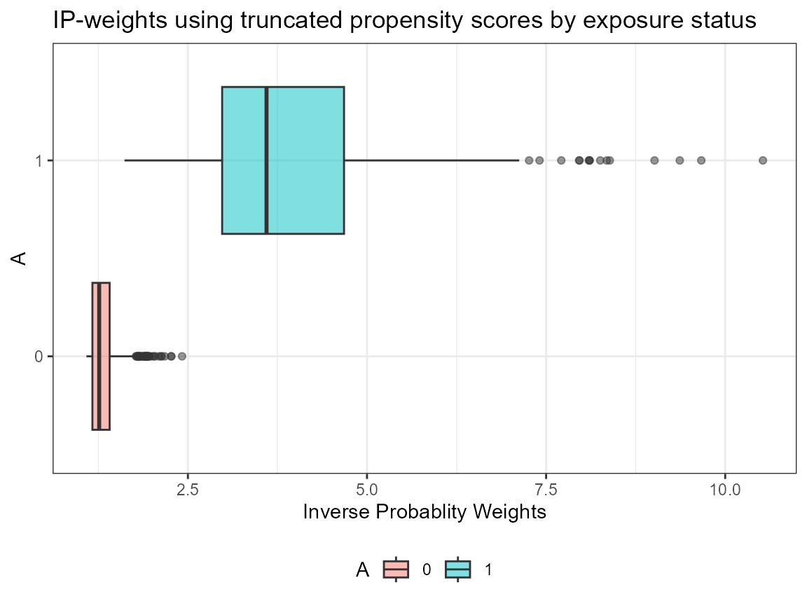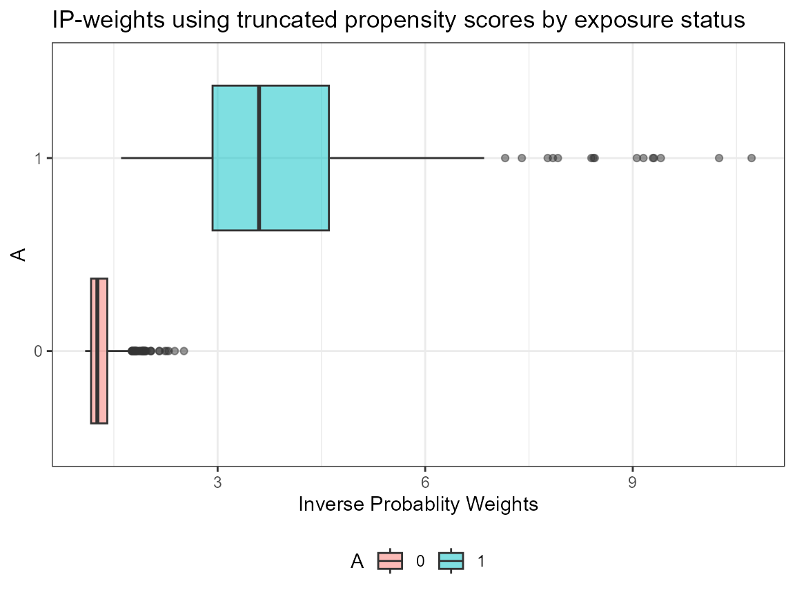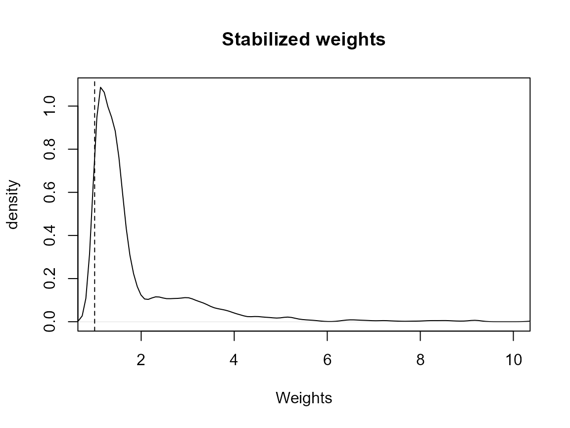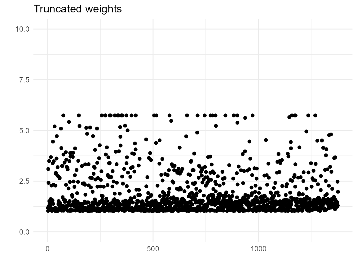 ## MSM, robust SE (ipw): 2.070809 0.8914133 3.250204Investigate (extreme) weights - truncation?
