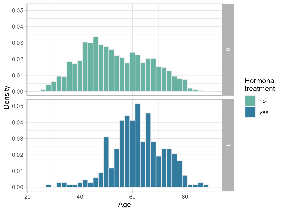 plot.age <- ggplot(bcrot, aes(x=age, after_stat(density)), fill=as.factor(hormon)) +