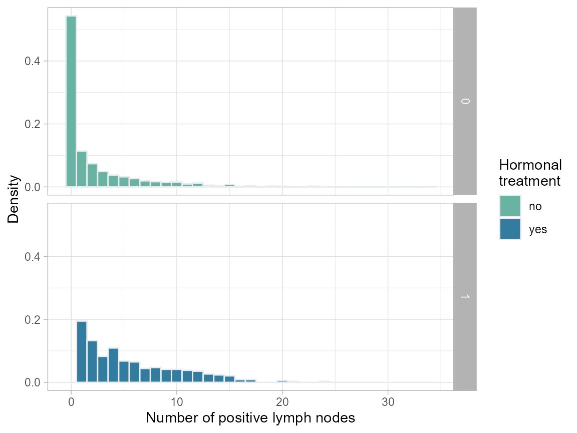 plot.nodes <- ggplot(bcrot, aes(x=nodes, after_stat(density)), fill=as.factor(hormon)) +