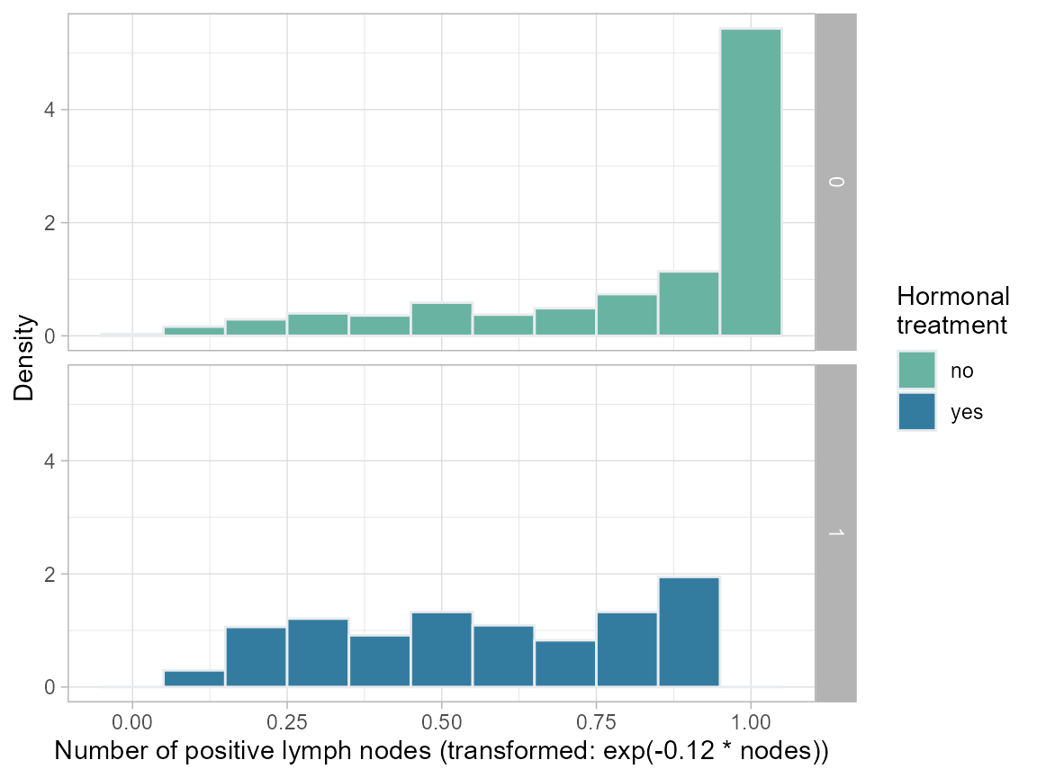 labs(x = "Number of positive lymph nodes (transformed: exp(-0.12 * nodes))",