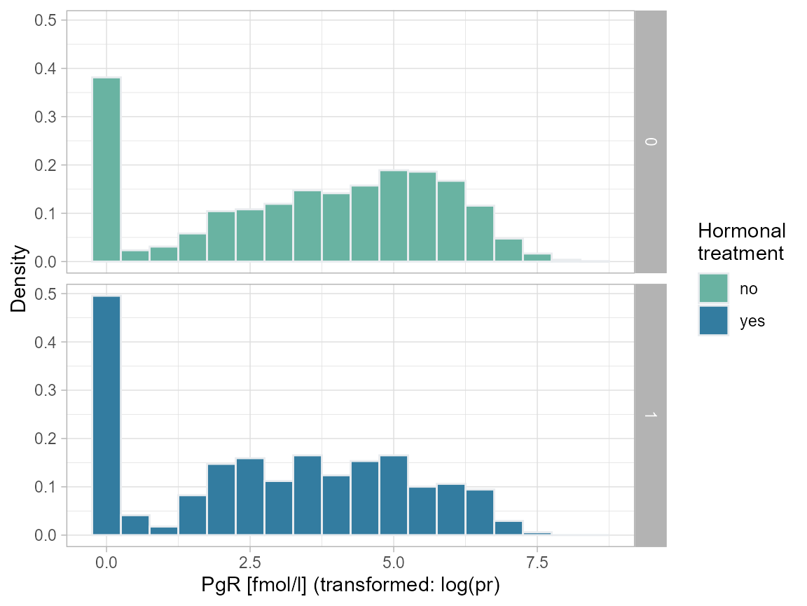 labs(x = "PgR [fmol/l] (transformed: log(pr)", y = "Density") +