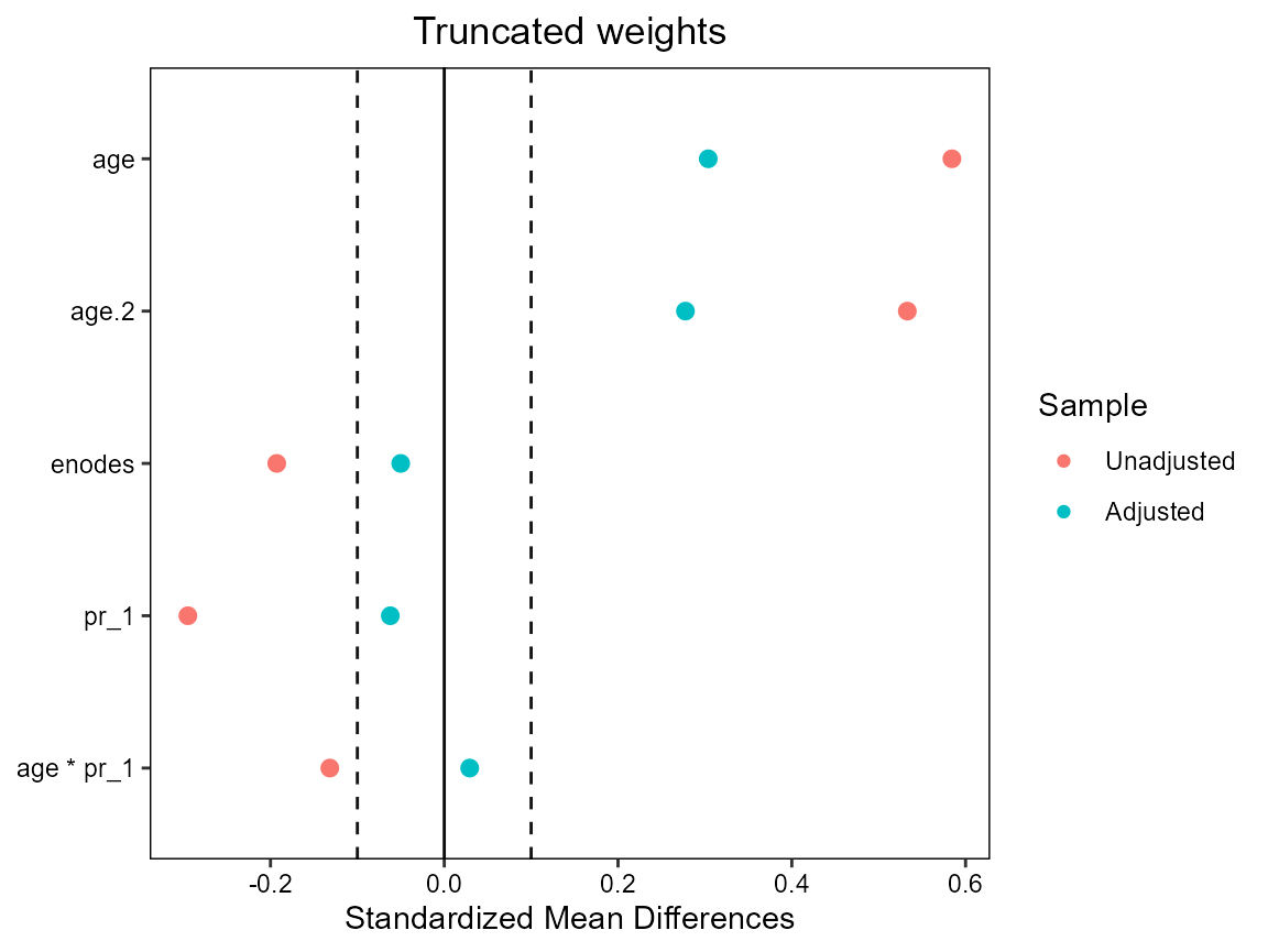 We also find that we have some extreme weights (though, I have seen worse). The weighted data does not achieve balance in age and enodes; this could be due to lack of positivity and/or because the PS model is bad.