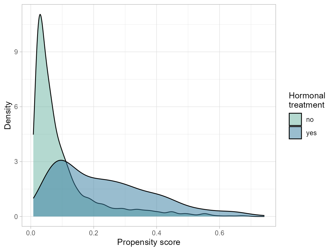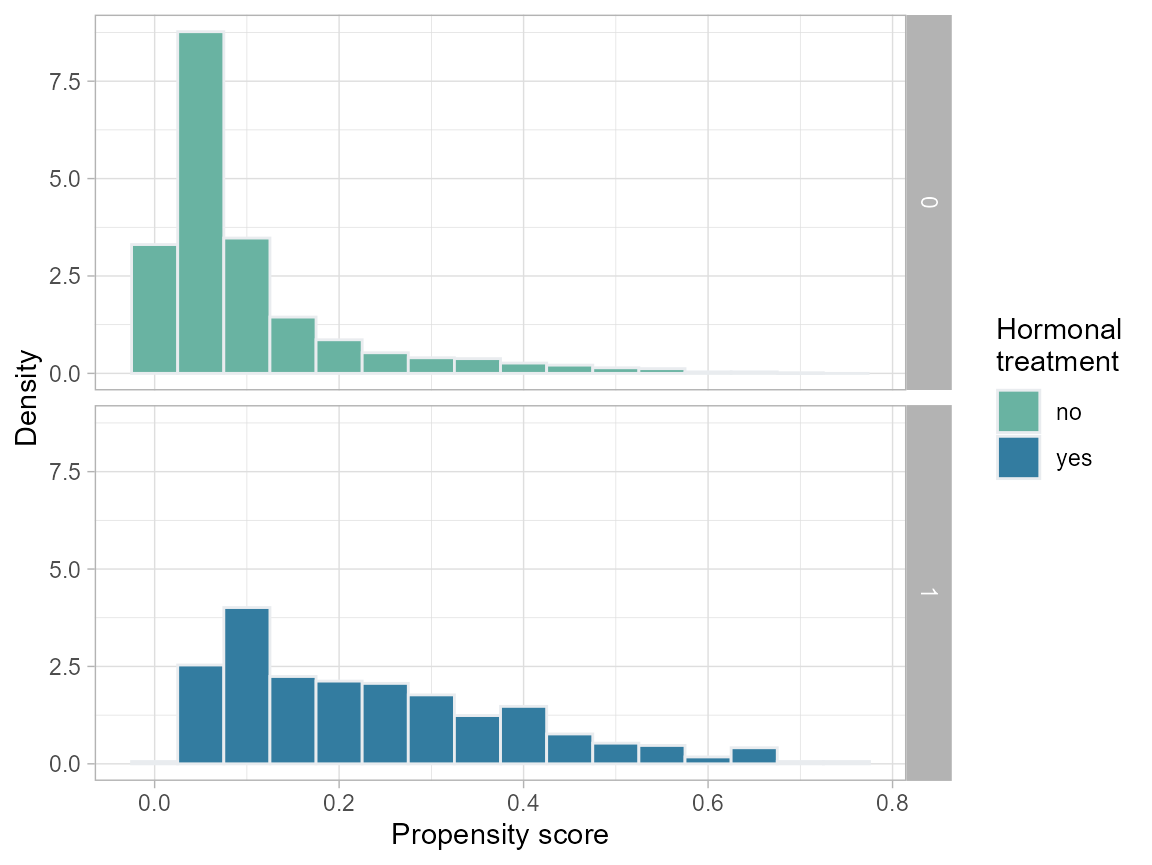 ggplot(data = bcrot, aes(x = ps, after_stat(density), fill = as.factor(hormon))) +